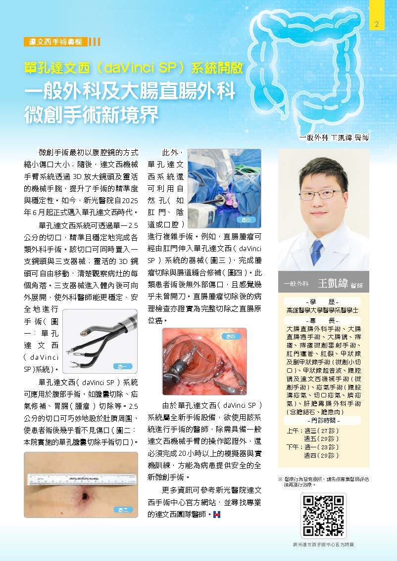 追求創新與卓越是新光醫院的精神,為了提高病患更高品質的醫療服務,新光醫院於2014年起設置了達文西微創手術中心。
