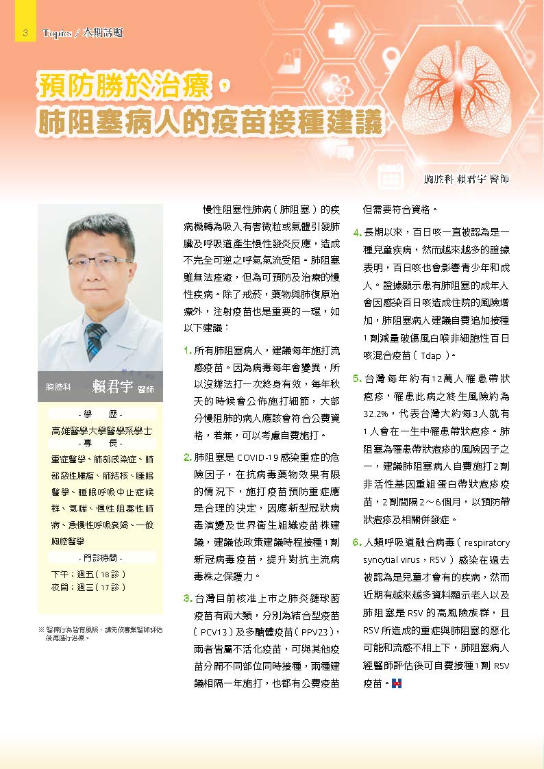 預防勝於治療 ,肺阻塞病人的疫苗接種建議。